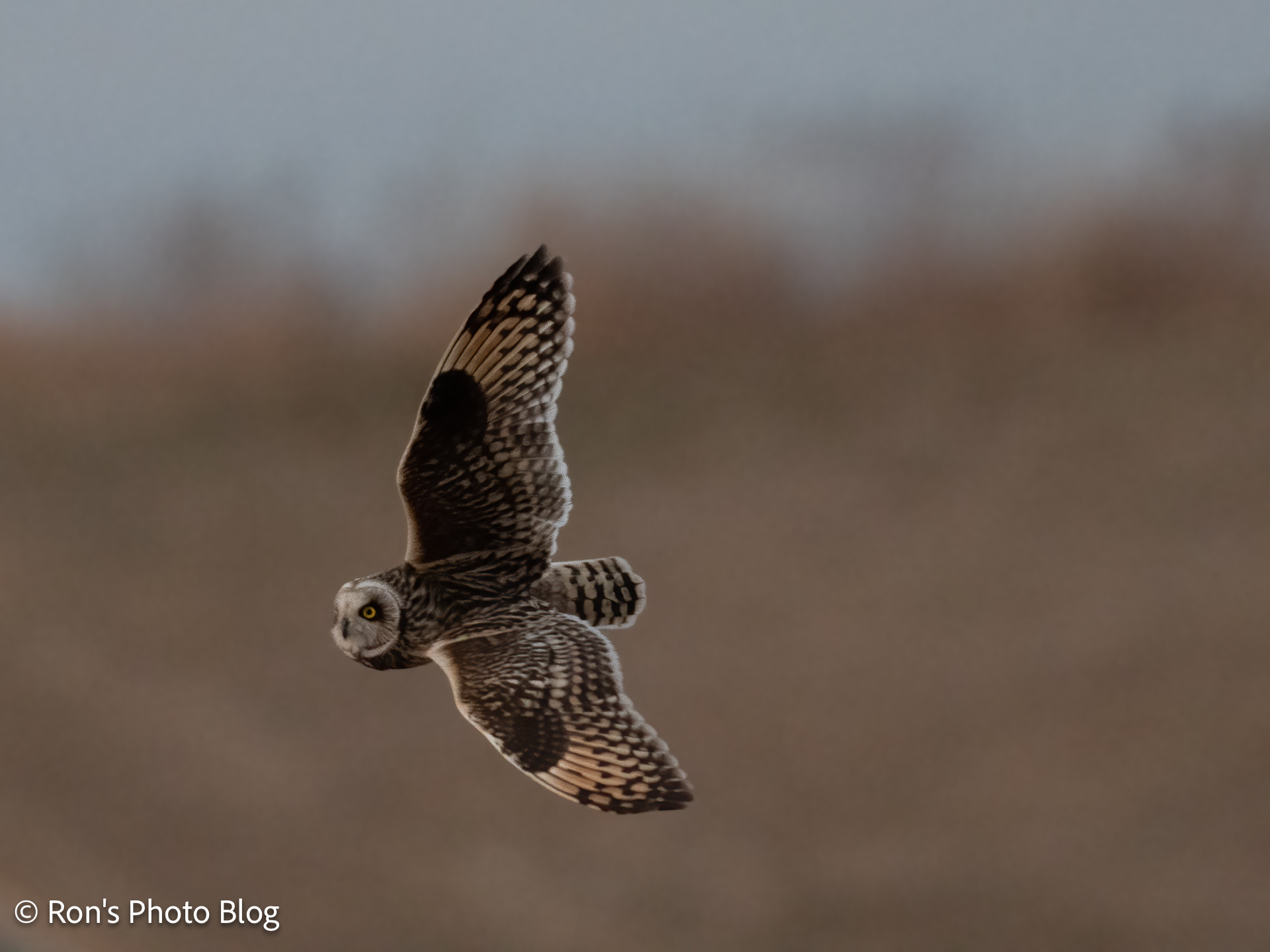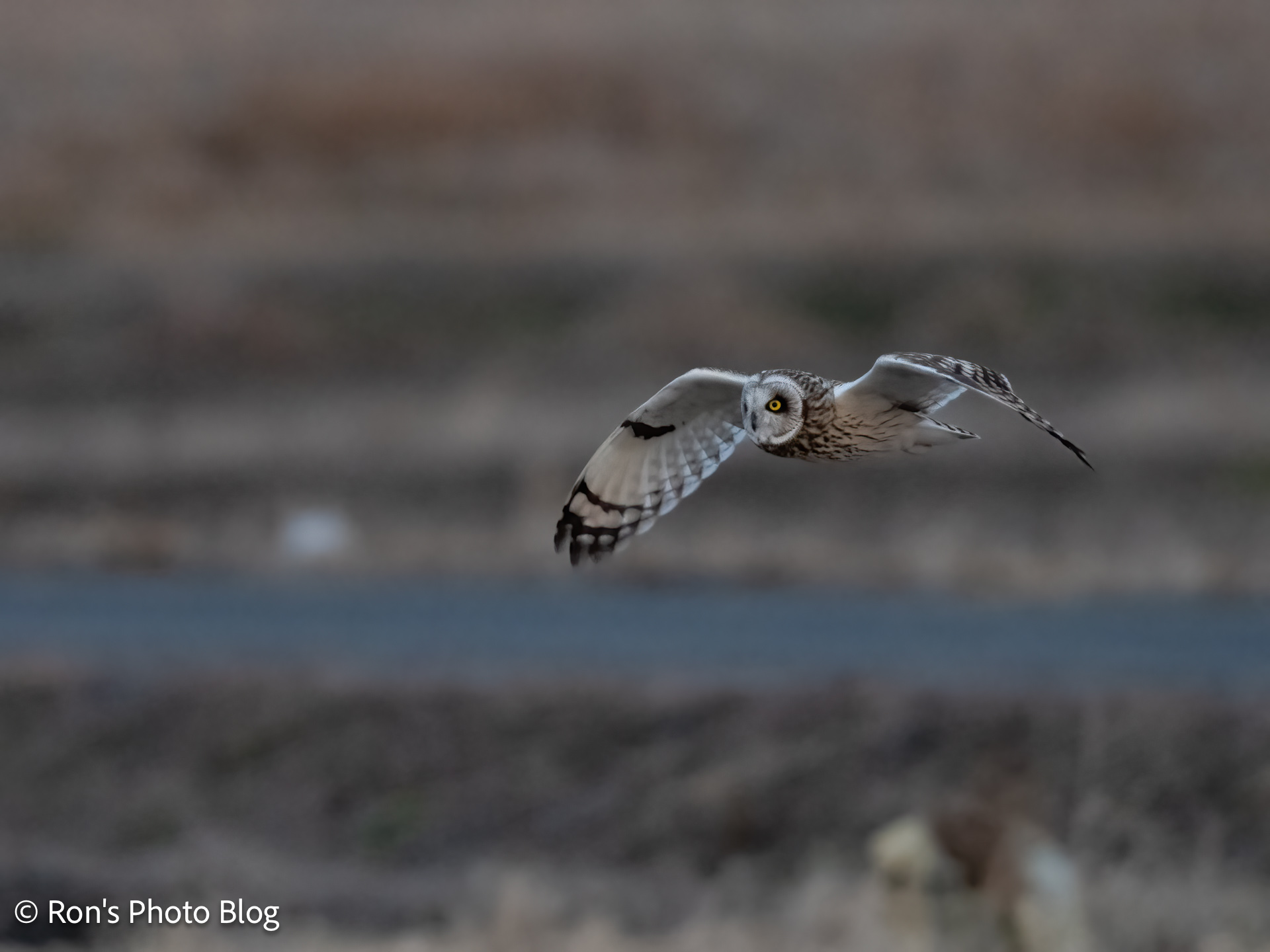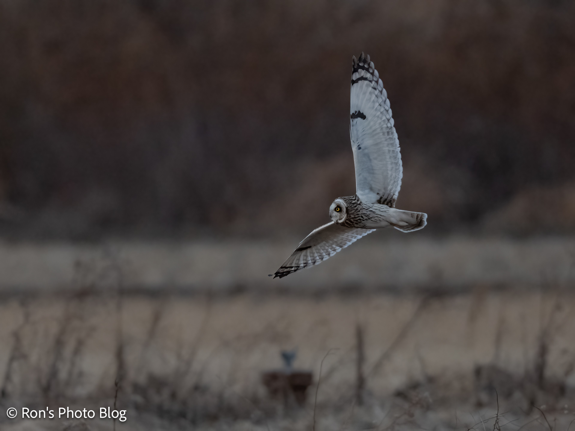 みなさんで、飛び去った方をしばらく眺めていたところ、先ほどと近い場所でふたたびコミミズクが飛んでいました。別の個体かもしれません。
